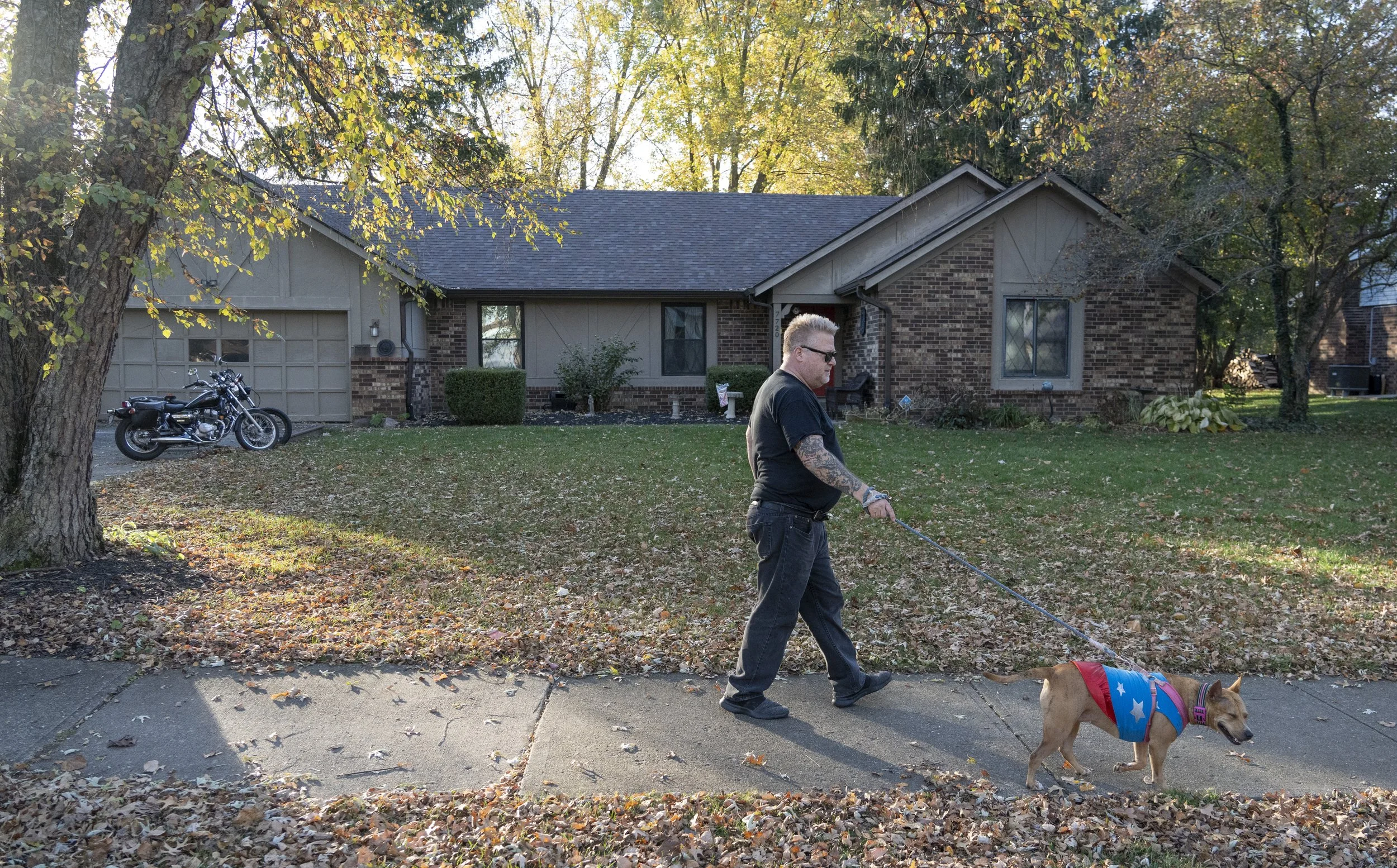 J.J.Pearson walks his dog Blue on Sunday, Nov. 5, 2023 in front of his home Indianapolis. “I wouldn’t know what life would be like without doggies,” said Pearson, who rescued Blue from a truck stop after she followed his truck down the on ramp.